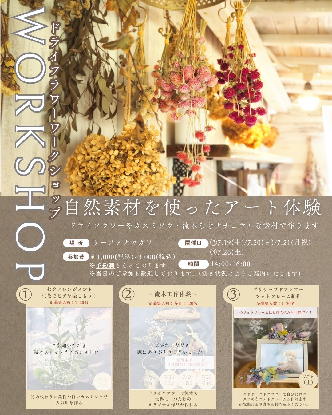 リーファナカガワでは7月26日(土)に、親子で参加できるドライフラワーワークショップ第3弾「フォトフレーム制作」を開催します✨